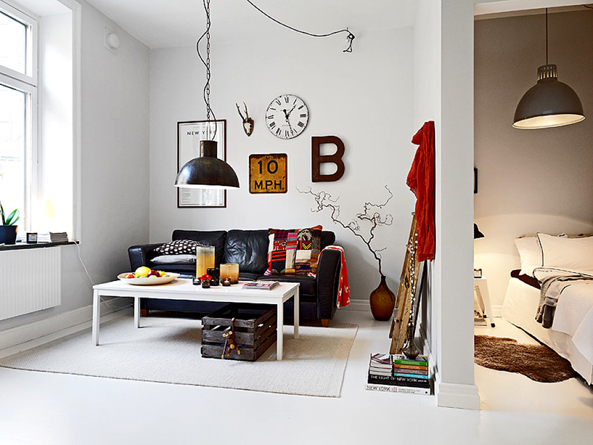 Один-два гардеробы на средней линии полностью разделят комнату на гостиную и спальню. Две зоны также могут быть выполнены в разных стилях, если вкус хозяина допускает разнообразие.