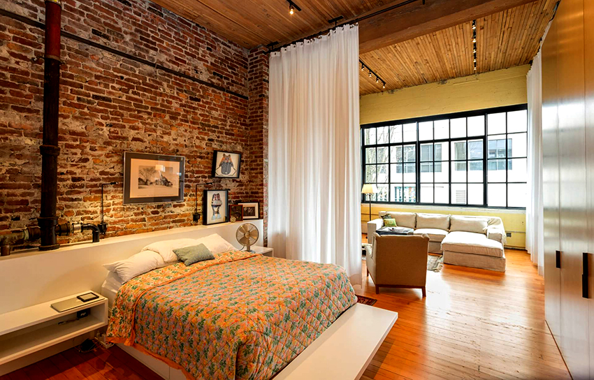 Удобный раскладной диван в интерьере спальни-гостиной стиля лофт