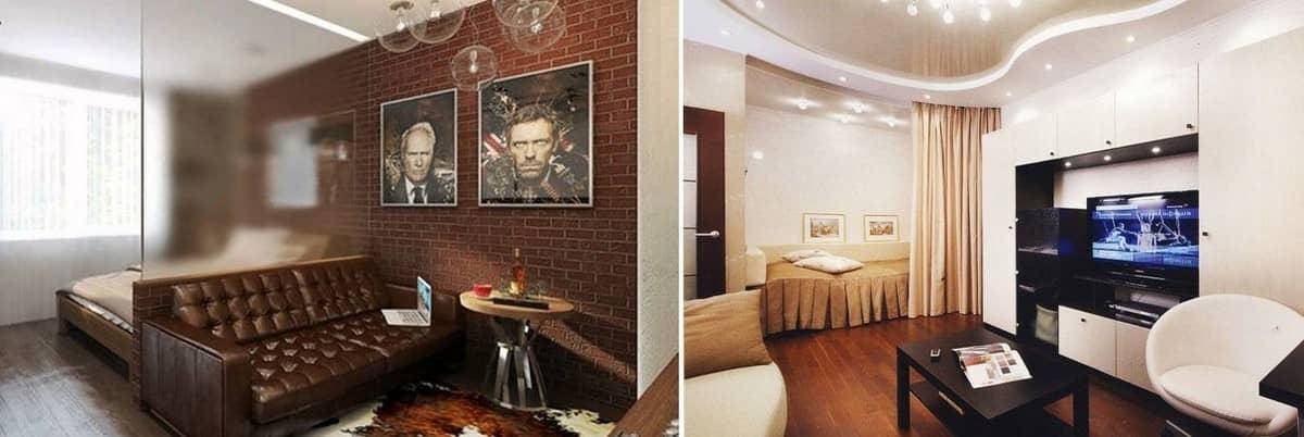 Один-два гардеробы на средней линии полностью разделят комнату на гостиную и спальню. Две зоны также могут быть выполнены в разных стилях, если вкус хозяина допускает разнообразие.