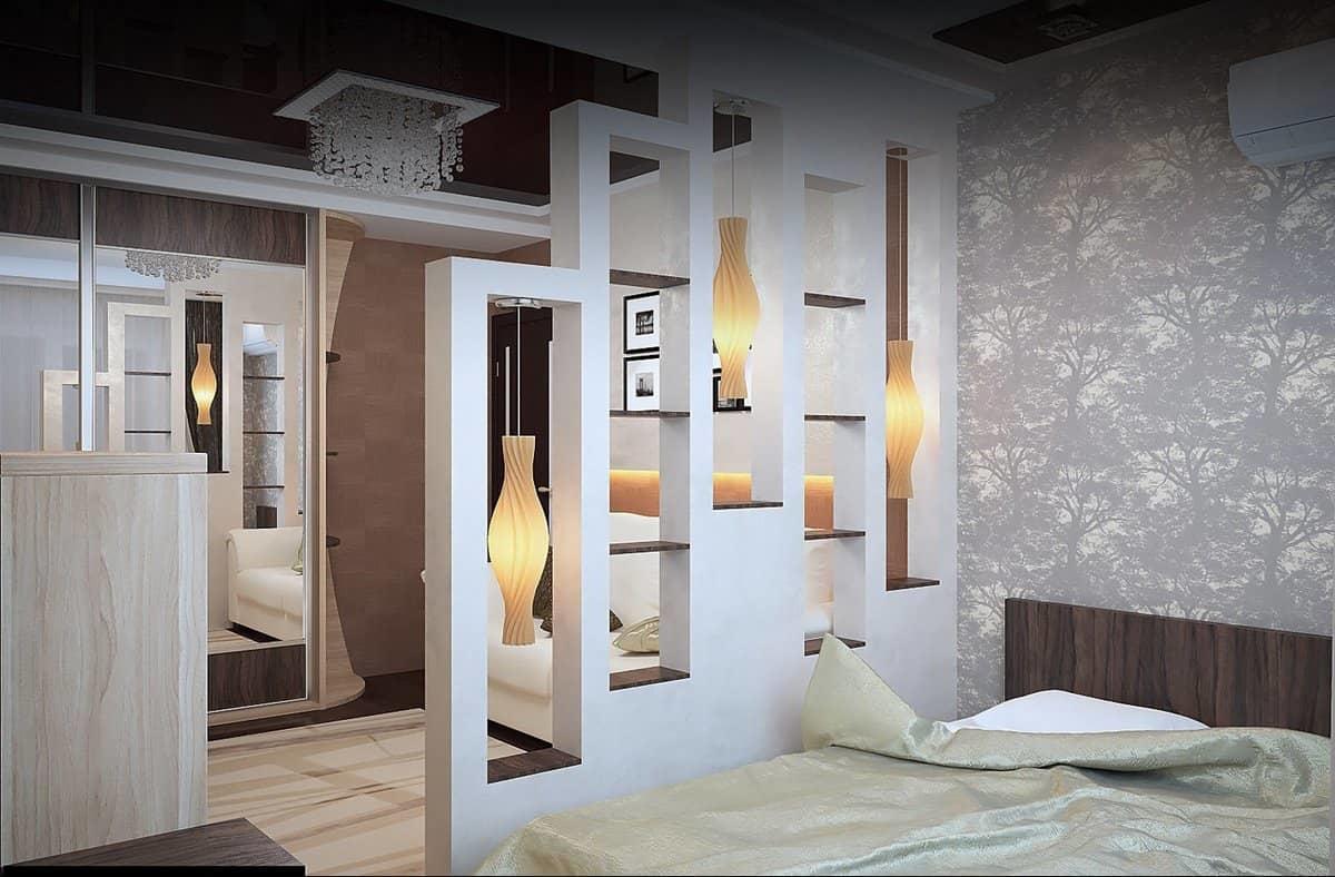 Подробнее поговорим о зонировании спальни-гостиной, используя различные разновидности перегородок.