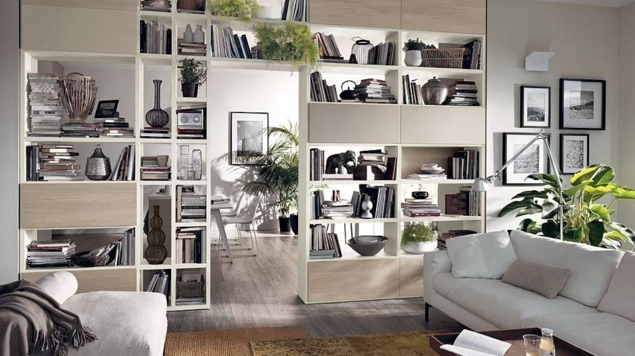 Открытые стеллажи – идеальный способ визуально разделить комнату. Не рекомендуется заставлять все свободные полки предметами или книгами, лучше, если часть из них останется свободными.