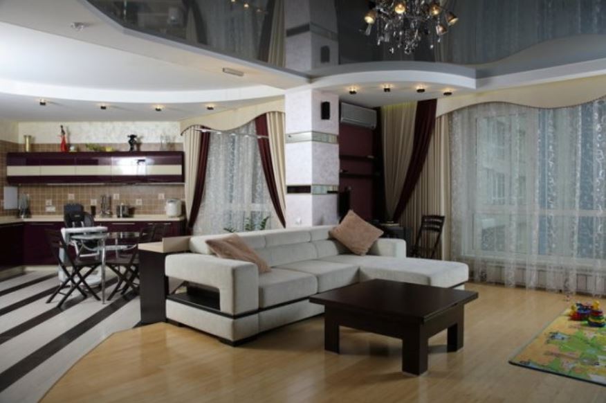 Квартира студия разделенная на зоны при помощи мебели, потолка и напольного покрытия