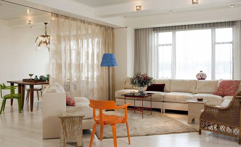 6.Шторы – легкий тюль, струящиеся кисеи или плотный занавес отделят кухню от гостиной, не отягощая интерьер.