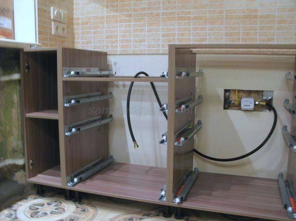 При замерах нередко приходится сталкиваться с трудностями. Например, на стенах могут располагаться газовые или водяные трубы – все это нужно будет учитывать при монтаже кухни, вырезая соответствующие отверстия. Сделать это проще всего электрическим лобзиком. Что касается мойки, то обычно для нее тумба идет без задней стенки, так как в этом месте находится развязка канализационных и водопроводных труб. Основная жесткость тумбы достигается благодаря металлическим уголкам.