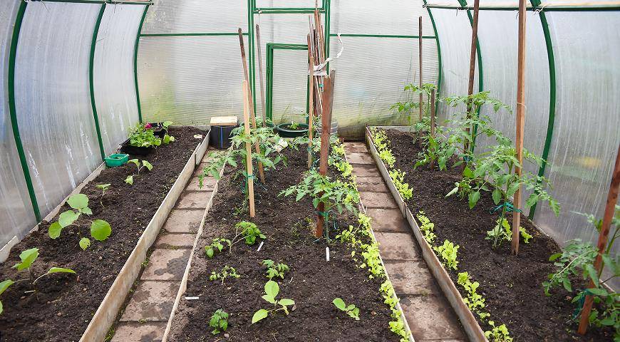 В больших теплицах главным фактором, лимитирующим рост и развитие растений, является высота культуры. Если на краевых грядках высадить высокорослые томаты или поднять на шпалеру огурцы и фасоль, а низкорослые (перцы сладкие, баклажаны, салаты, свеклу, капусту) разместить на средней грядке, то последние будут испытывать недостаток освещения. В результате появятся заболевания, размножатся вредители. Такой же результат ожидает и слишком загущенные посадки. Оптимальным вариантом будет размещение высокорослых культур на средней грядке, а по бокам теплицы — низкорослых.