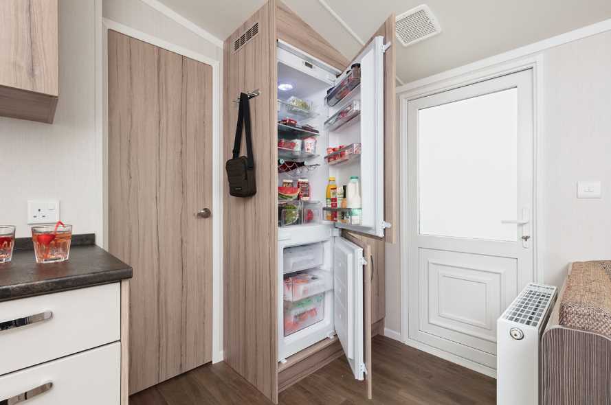 - конструкция холодильного отделения встроена в стену, за счет чего обеспечивается экономия пространства;