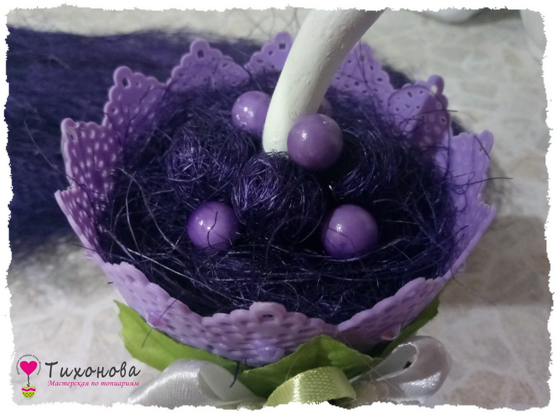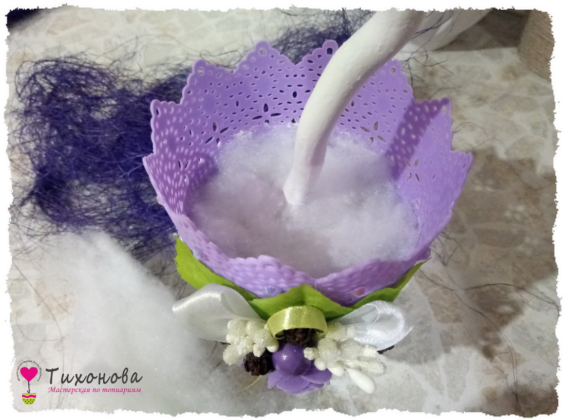 На гипсовую заливку укладываем сизаль фиолетового цвета. Для экономии можно сделать прослойку из синтепона, ваты или другого доступного материала. У основания топиария клеим несколько сизалевых шариков и гладких ягод.