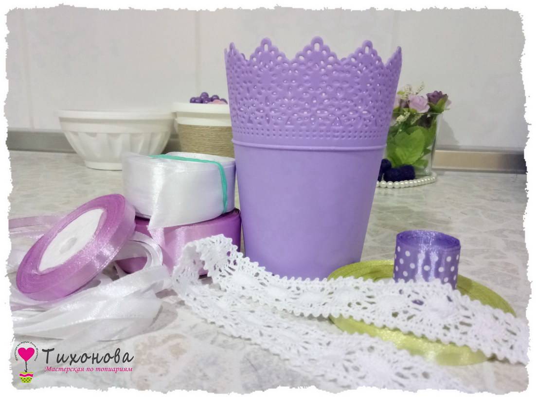 Для изготовления топиария из атласных лент вам понадобятся следующие материалы и инструменты:
