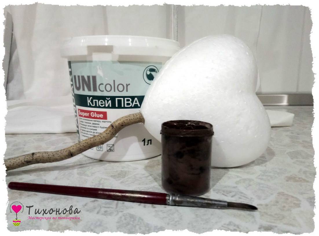 Для дерева счастья используем пенопластовое сердце, в основание которого фиксируем на клей изогнутую ветку. Основу красим в коричневый цвет, чтобы горячий силикон не плавил пенопласт. Кучно заклеиваем сердце кофейными зернами так, чтобы просветов было минимальное количество.