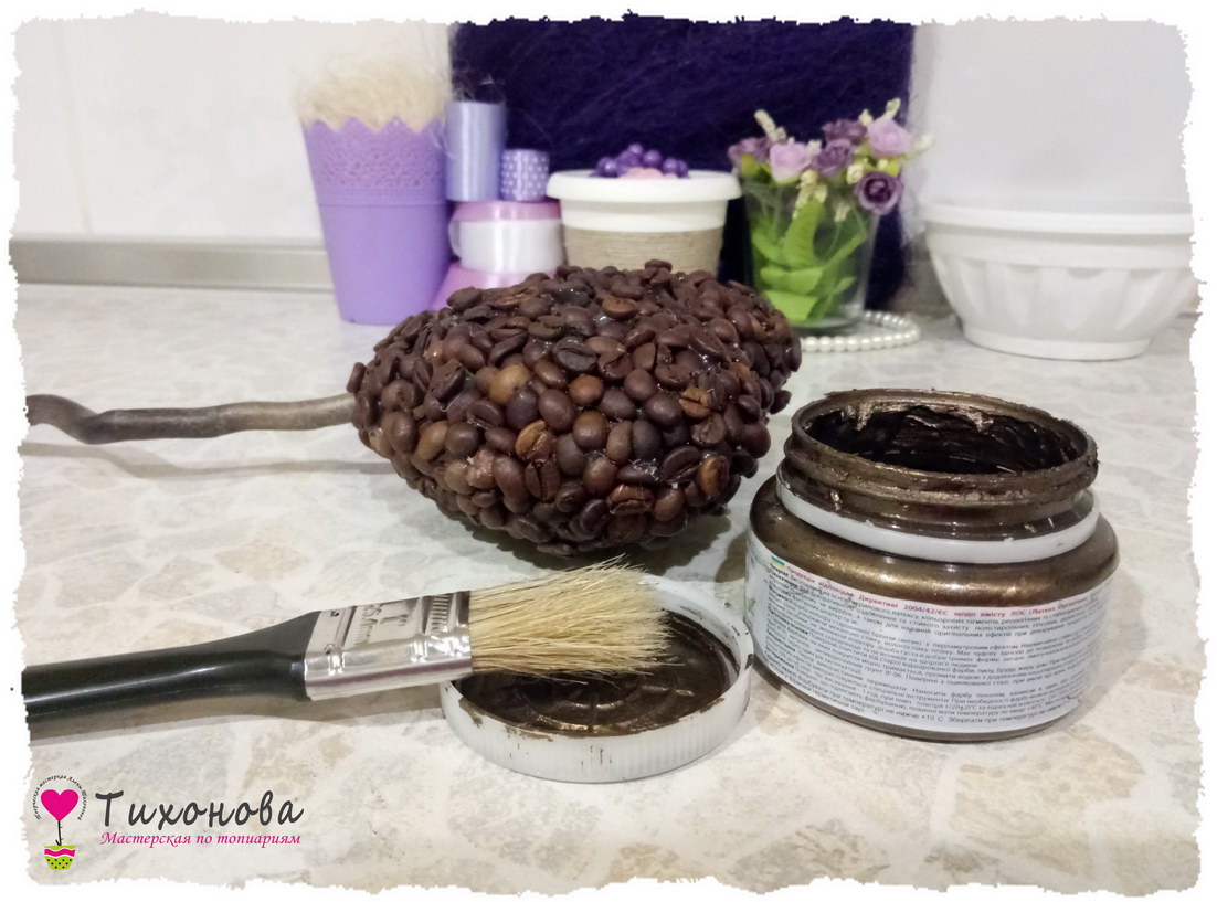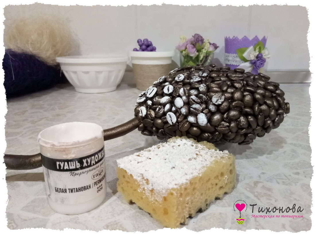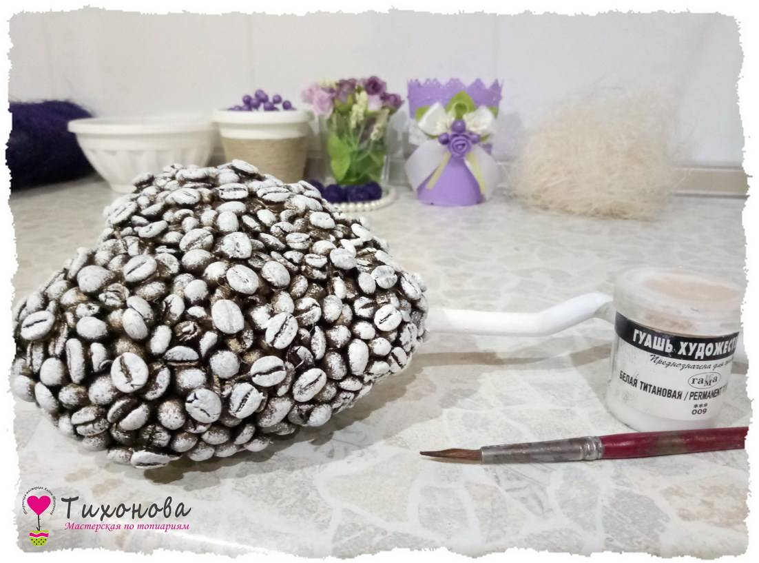 Красим кофейные зерна бронзовым акрилом, полусухой кистью. По бронзе слегка наносим губкой белый акрил. Кроме того, сейчас удобно выкрасить ствол топиария (заранее отшлифованный) в белый цвет.