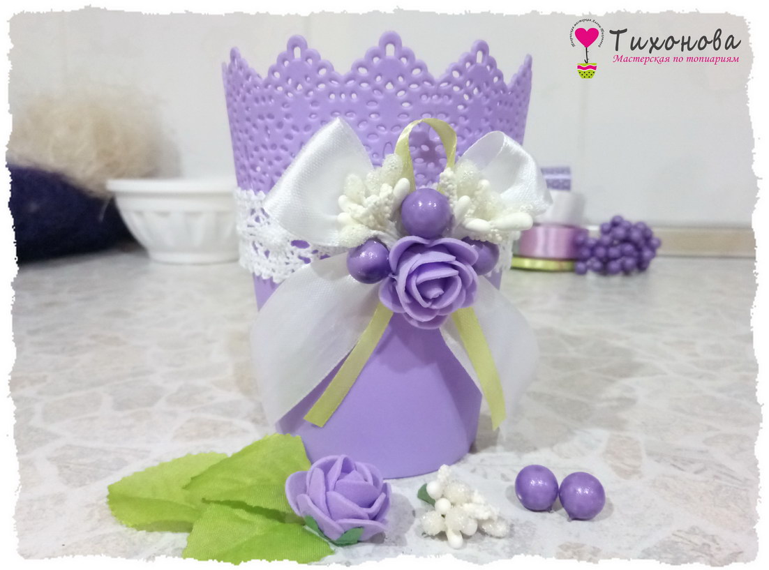 Горшок топиария декорируем белым кружевом и атласным бантом. На бант клеим фоамирановую розу, тычинки и сиреневые гладкие ягоды.