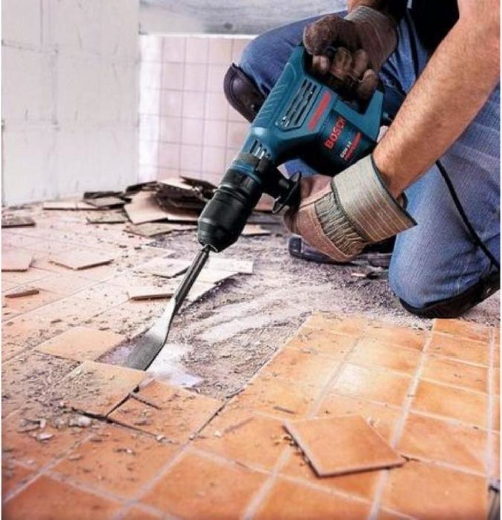 Перфоратор долбит сам. Все что надо — подобрать правильный режим и лопатку. Если надо одновременно снимать плиточный клей большой толщины, нужен массивный наконечник. Если будете пытаться отбить только плитку, лопатка — тонкая и узкая. И придется искать угол наклона инструмента.