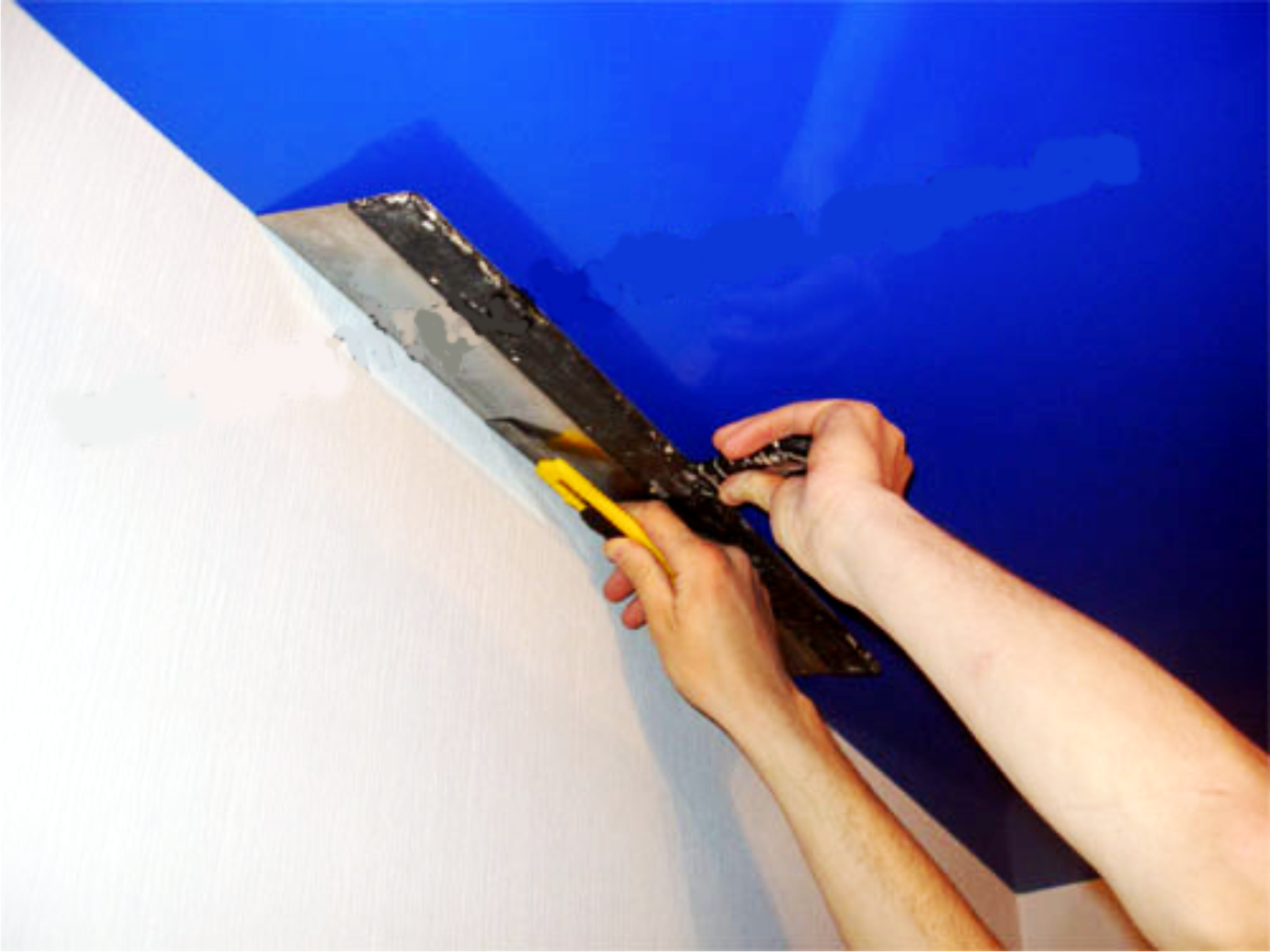 Для демонтажа обоев под натяжным потолком, необходимо очень острым малярным ножом, максимально аккуратно, чтобы не задеть пленку лезвием, подрезать верхние края полотен. После чего края обоев следует промокнуть влажной губкой и через несколько минут, используя шпатель 450-600 мм, отсоединить от поверхности стены. Далее удалять обои в зависимости от их типа.