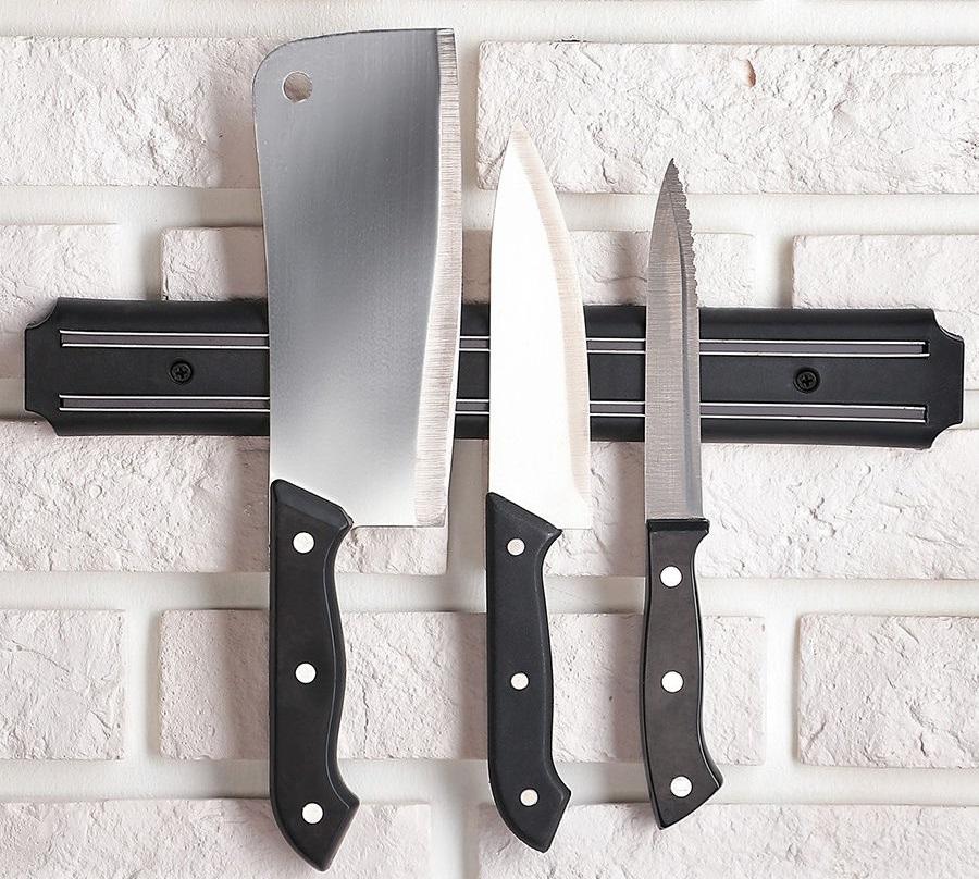 Кухонные ножи чаще всего хранят в специальных подставках или просто кладут их в ящики. Недостаток этих способов в том, что лезвия нужно протирать насухо, иначе им грозит ржавчина. К тому же влага накапливается в узких пазах, создавая питательную среду для размножения бактерий. Магнитное крепление для ножей удобно: протянул руку – и повесил или взял любой из них. Держатели производятся разных типоразмеров и цветов (обычно они черные, металлик или комбинированные). Магнит для ножей представляет собой планку, крепящуюся горизонтально. Этот стильный предмет сдержанно украшают обстановку. Устанавливать магниты для ножей на кухню просто: они монтируются на стену или мебель с помощью шурупов-саморезов или специального клея. Но важный момент: желательно приобретать держатели у сертифицированных продавцов (например, в Мире Магнитов) — иначе есть риск через каких-то пол года отвинчивать от стены ржавый кусок магнита, который призван украшать интерьер, но на деле его портит.