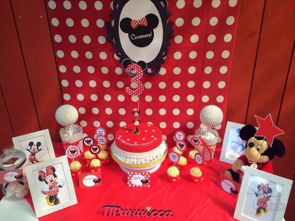 Основа декора в стиле Микки – горох и бантики. В качестве фона для фото можно использовать скатерть или просто ткань с принтом гороха. Гирлянда, шарики и помпоны также должны быть в одной цветовой гамме.