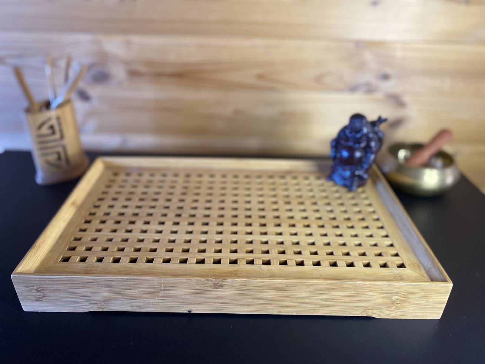 Чайная доска (чабань). Это доска с изящной резьбой и поддоном внутри. В неё сливают воду и остатки чая. Мастера рекомендуют выбирать чабань с металлическим поддоном — тогда в звуках падающих капель чая слышится стук дождя по металлическому подоконнику.