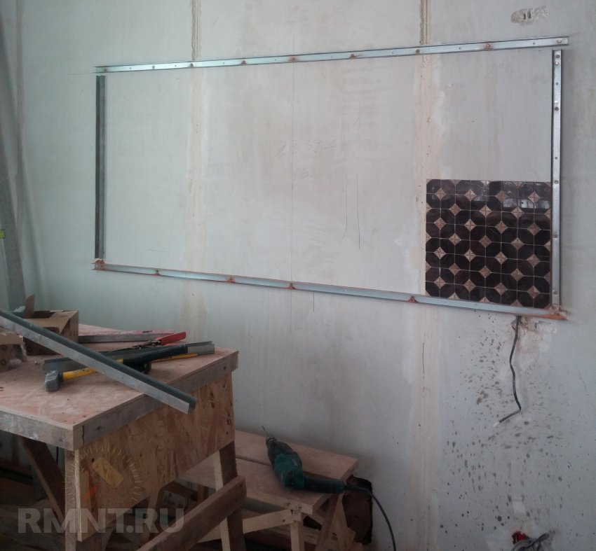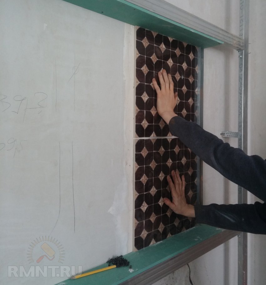 Внимание! Во время примерки плитки учитывайте толщину шпатлёвки 2–3 мм. Обратите внимание на вертикальную обвязку каркаса и направляющих
