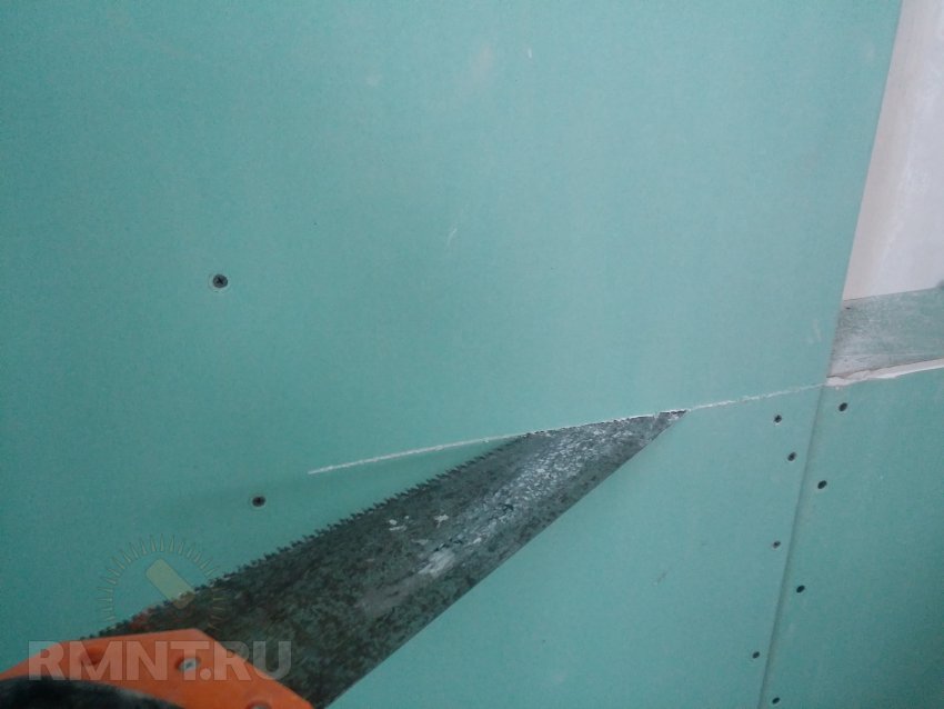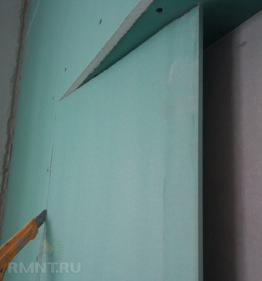 И ножом подрезаем по вертикали. Такой способ не требует разметки и страхует от ошибки при разметке — ГКЛ режется по месту, а направляющей служит одна из плоскостей ниши.