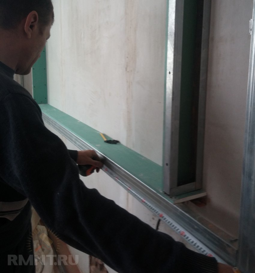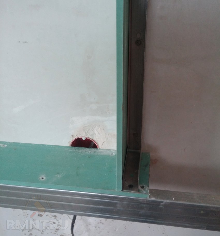 Обратите внимание, что каждый профиль устанавливается немного вглубь проема, оставляя место для монтажа листов ГКЛ. То есть, расстояние от стены до профиля должно равняться толщине листа