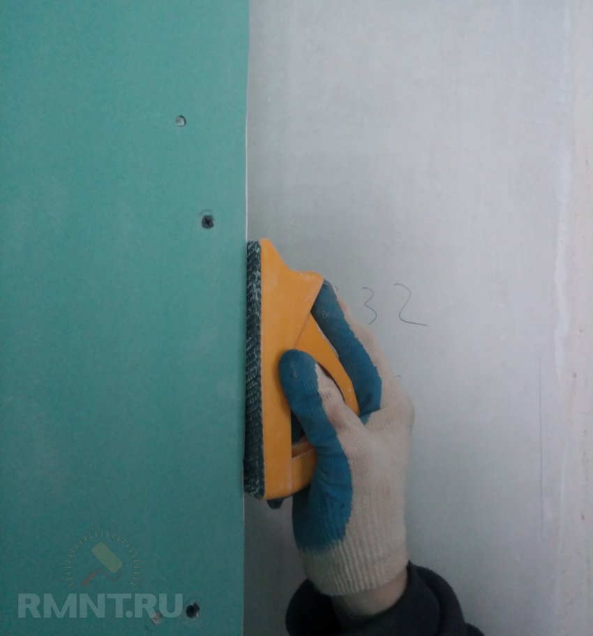 Осталось подготовить плоскость для шпатлевания. Расшиваем углы гипсовой тёркой и стыки ножом.