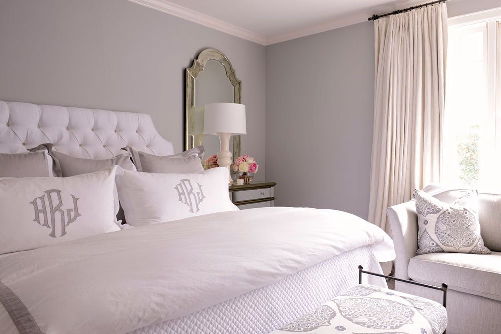 Для нежного дизайна спальни стоит выбрать серо-белый цвет обоев, пола и даже бельевого шкафа — такой дизайн станет идеальным фоном для любого выбора постельного белья, будь то однотонное или фантазийное, уйти просто невозможно неправильный.