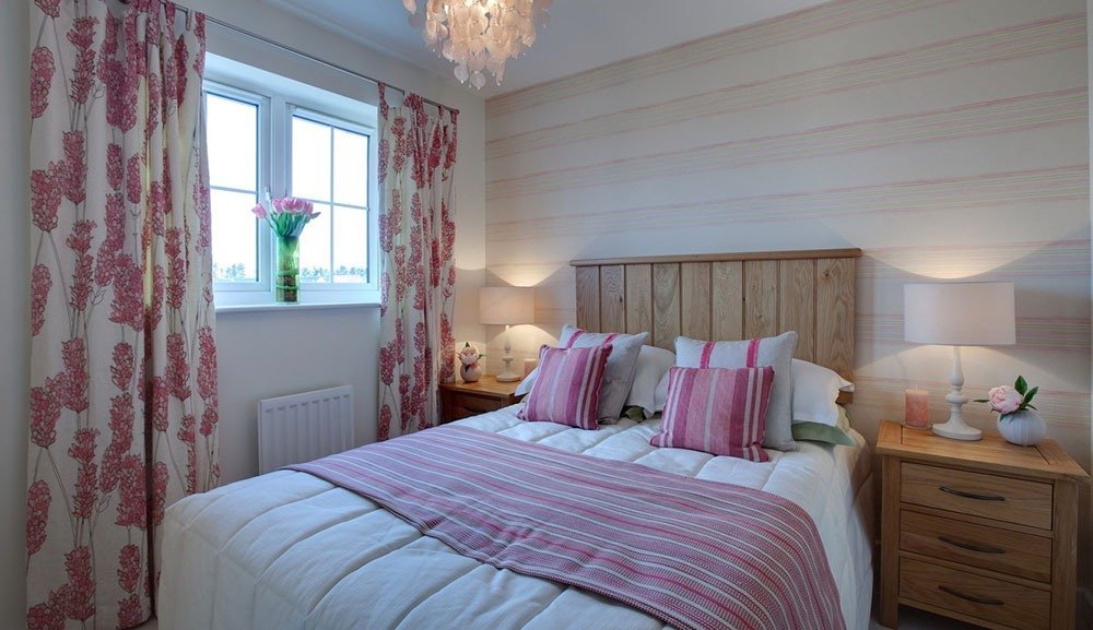 Выбор обоев, мебели и текстильного декора подчиняется правилам цельного интерьера. Обои с геометрическим узором или яркие будут прекрасно гармонировать с неброскими римскими или французскими шторами.