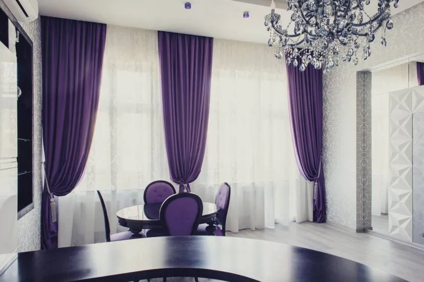 Выглядит вполне гармонично при правильном определении оттенка. Для темных стенок стоит подбирать светлые шторы (пастельно-фиалковые, лавандовые и т.п.). Светло-серые стены можно подчеркнуть более насыщенными оттенками фиолетового, например, темно-лиловым. Данное цветовое решение уместно, если оформляется интерьер в современном стиле.