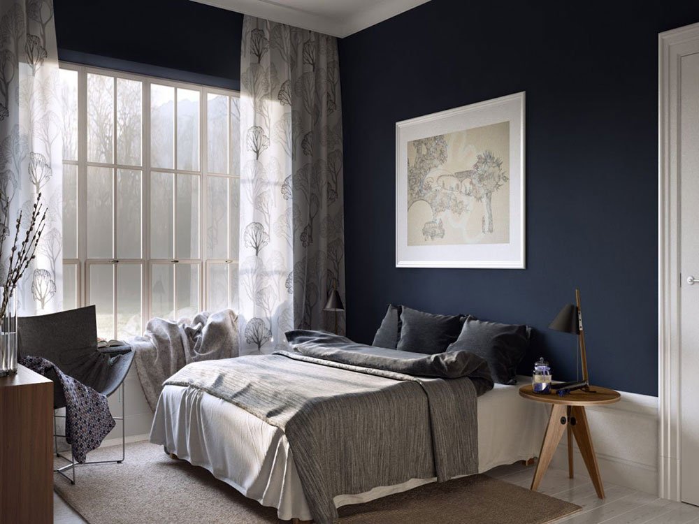 - Синий. Все вариации синего прекрасно сочетаются с холодной базой: ультрамариновый, сапфировый, бирюзовый. Потрясающий эффект дают занавеси с рисунком, который соединяет в себе сразу несколько вариаций синего. Данный вариант уместен в спальне, гостевой и кабинете.
