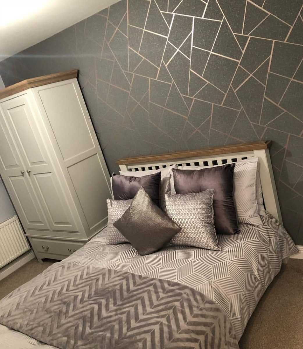 Чтобы добавить еще один штрих элегантности, вы можете использовать две хромированные настенные драпировки в качестве отличного светового решения. Установленные по обеим сторонам кровати, они образуют идеальные прикроватные светильники. Хром — лучший выбор для металлических цветов, чтобы серый цвет оставался прохладным.