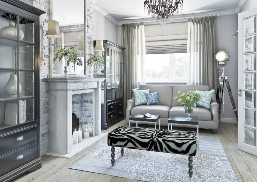 Серо-белые шторы с контрастным рисунком привлекут внимание к окнам и создадут в помещении атмосферу уюта