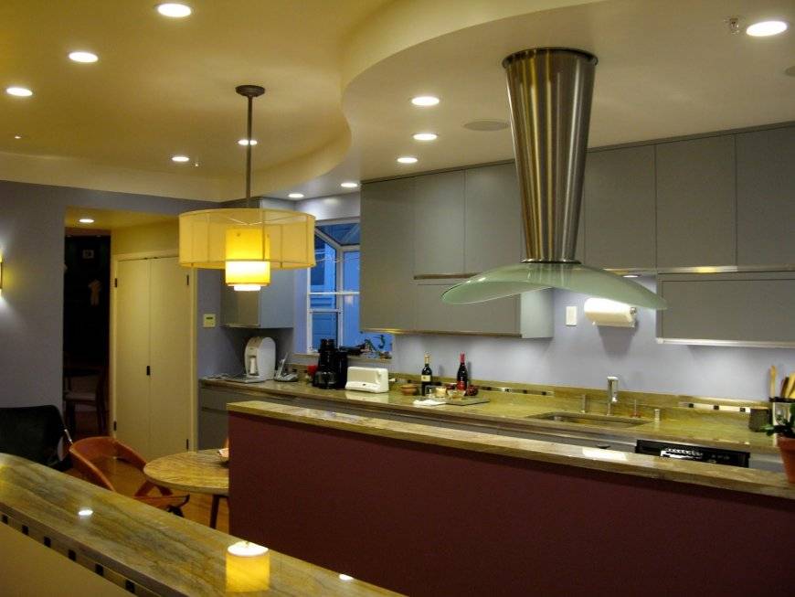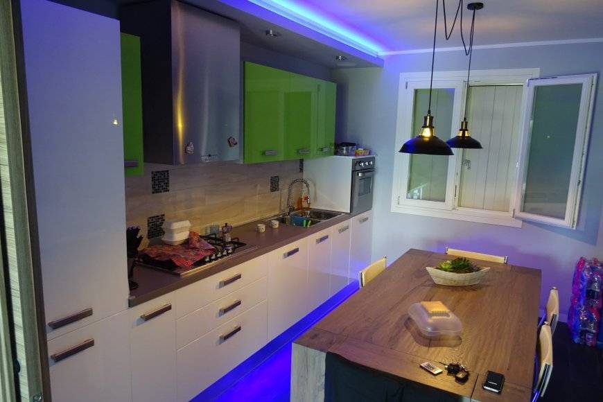 Если потолки высокие – можно применять лампы на подвесах или светильники на натяжной потолок на кухню, вытянутые вниз. Сложнее организация света при низких потолках.