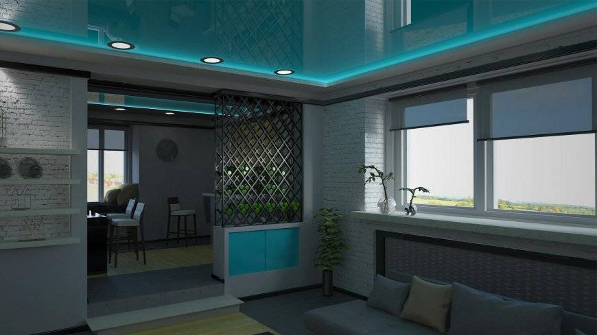 Двухуровневый сатиновый натяжной потолок в интерьере кухни-гостиной