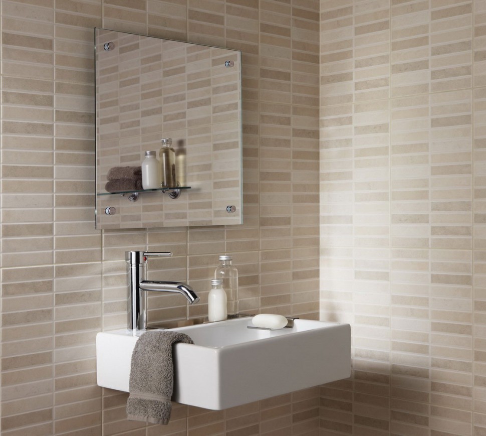 При оформлении стен маленького помещения не стоит использовать крупные панно, поскольку это визуально приближает стену. Крупноформатное панно допустимо только на дальней стене в узкой и длинной ванной комнате. Зону над умывальником, часть стены над ванной можно выделить при помощи мозаики, подобрав материал, который будет удачно сочетаться с плиткой, из которой выполнено основное покрытие. Не стоит использовать плитку с крупным орнаментом, предпочтительнее смотрится мелкий узор, а также узкий фриз.