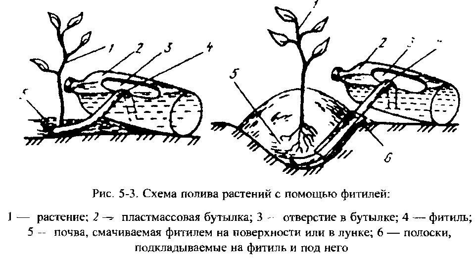Самый простой поверхностный капельный полив может быть организован на основе пластиковых баклаг или бутылок от 1,5 л, установленных в рядах между кустами, см. рис. Фильеры в них делают на высоте 3-5 см от дна, чтобы осадок в воде их не засорял. Такое орошение пригодно для влаго- и светолюбивых культур с достаточно высоко расположенными над грунтом плодами напр. томатов, баклажанов. Серьезный недостаток этой «системы» – обязательно требуется мульчирование рядов; почему – см. выше.