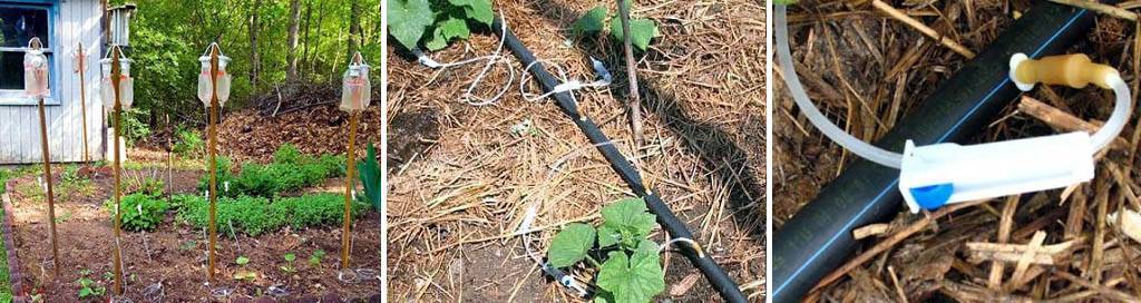 Помимо бутылок, для точечного индивидуального капельного полива иногда пытаются использовать медицинские капельницы, см. след. рис. Однако стабильно-положительные долговременные результаты таких опытов неизвестны по след. причинам, обусловленным тем, что медицинские капельницы – оборудование одноразовое: