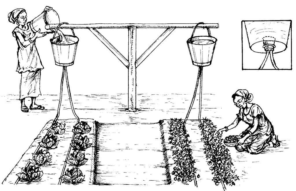 Для небольшого огорода можно обустроить энергонезависимую систему капельного полива. Для этого на возвышении в 1,5 метра устанавливается герметичный резервуар.