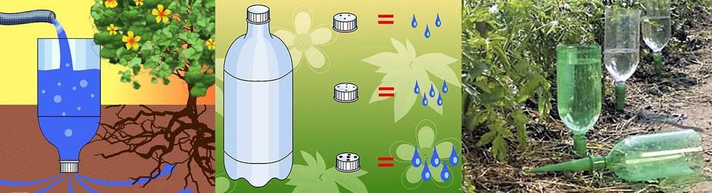 Возле куста растения, нуждающегося в поливе, вкапывается пластиковая бутылка, пробкой вверх. В ее донышке проделывают несколько отверстий, через которые в почву будет медленно поступать вода. Через горлышко емкость пополняют водой, потом пробку слегка прикручивают, чтобы уменьшить испарение. К недостаткам такого способа полива можно отнести быстрое засорение отверстий и непригодность его для тяжелых грунтов, которые плохо впитывают воду.