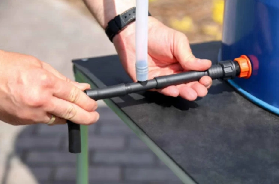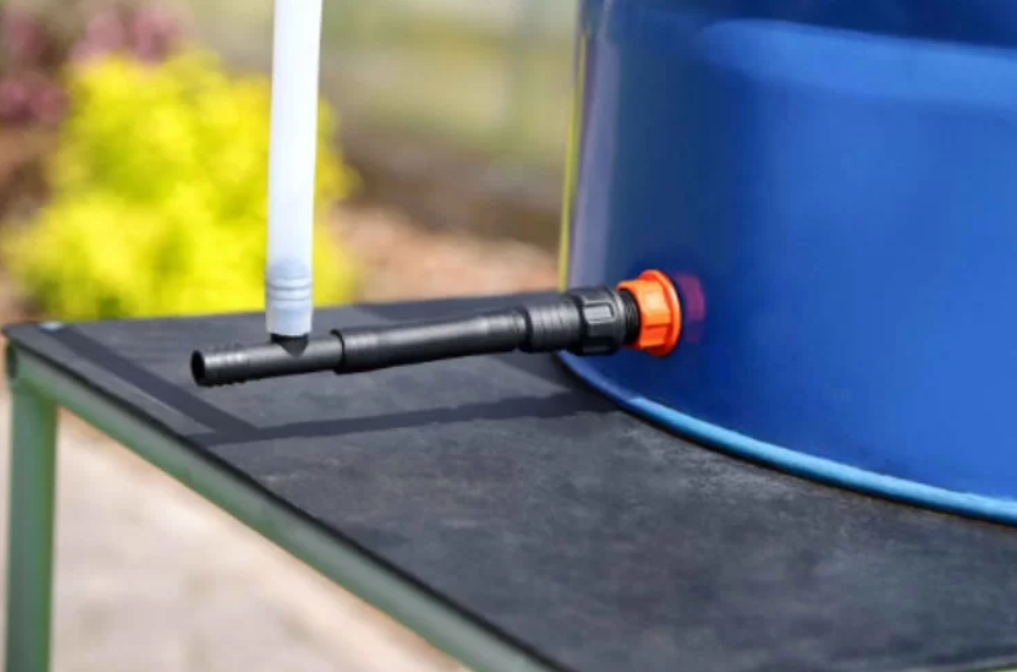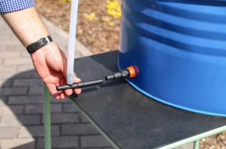 - Соедините небольшим куском магистрального шланга специальный штуцер типа «тройник», к которому присоедините прозрачную трубку для отображения уровня воды в бочке.