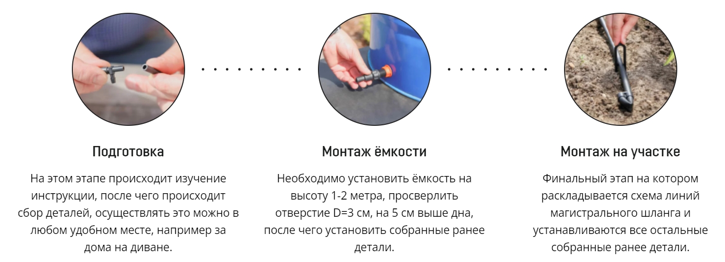 Собрать систему можно без специальных навыков и оборудования. Все комплектующие присутствуют в коробке, отдельно нужно приобрести только бочку или другую емкость для хранения воды. Работа по сборке состоит из следующих этапов.