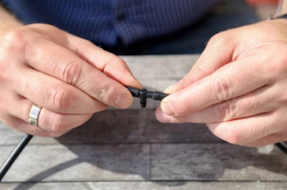 - Сборка капельниц. Надломите каждую трубку и отделите от кассеты. Соедините с более узким подающим шлангом, комплект которых можно найти в упаковке. Для удобства соединения конец шланга стоит опустить на несколько секунд в теплую воду для размягчения и большего удобства в монтаже. Полученные соединения попарно соедините друг с другом при помощи небольшого фитинга типа «тройник». Количество выполненных соединений должно равняться количеству растений.