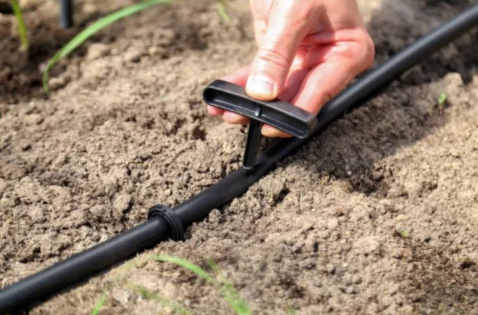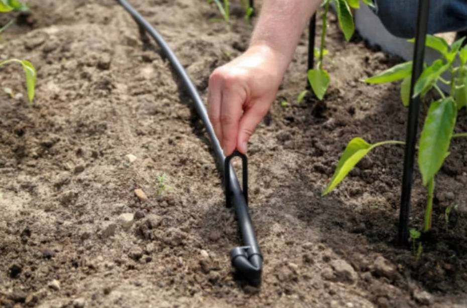 - Конец каждого магистрального шланга согните и закрепите специальным зажимом, который можно найти в купленном комплекте либо докупить отдельно. Получившийся магистральный шланг аккуратно разложите между растениями, фиксируя прижимами на равном удалении друг от друга.