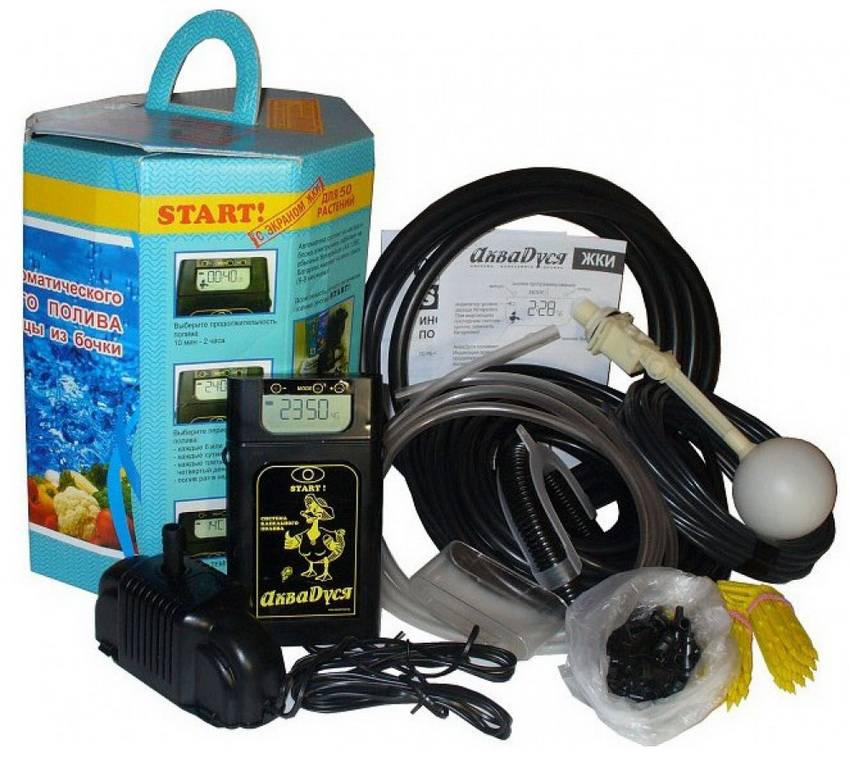 Белорусская система полива «АкваДуся» рассчитана на полив 50-60 растений. Можно приобрести механическую, полуавтоматическую и автоматическую модель. Система присоединяется к водопроводу или емкости, от чего будет зависеть стоимость набора. В комплект капельного полива для теплицы из бочки «АкваДуся» входят шланги, карандашные капельницы наружного типа, капельные ленты и соединительные элементы. Набор может быть укомплектован насосом, емкостью для воды и контроллером. Автополив не нуждается в подключении к сети, а работает от 8 батареек, которые могут служить несколько месяцев, не требуя замены.