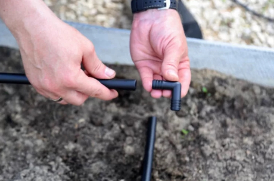 - Монтаж подводных капельных систем к магистральному шлангу. После соединения всех элементов пройдите на грядку для будущей интеграции в магистральный шланг. Напротив каждой пары растений, необходимо проделать отверстия шилом из комплекта.