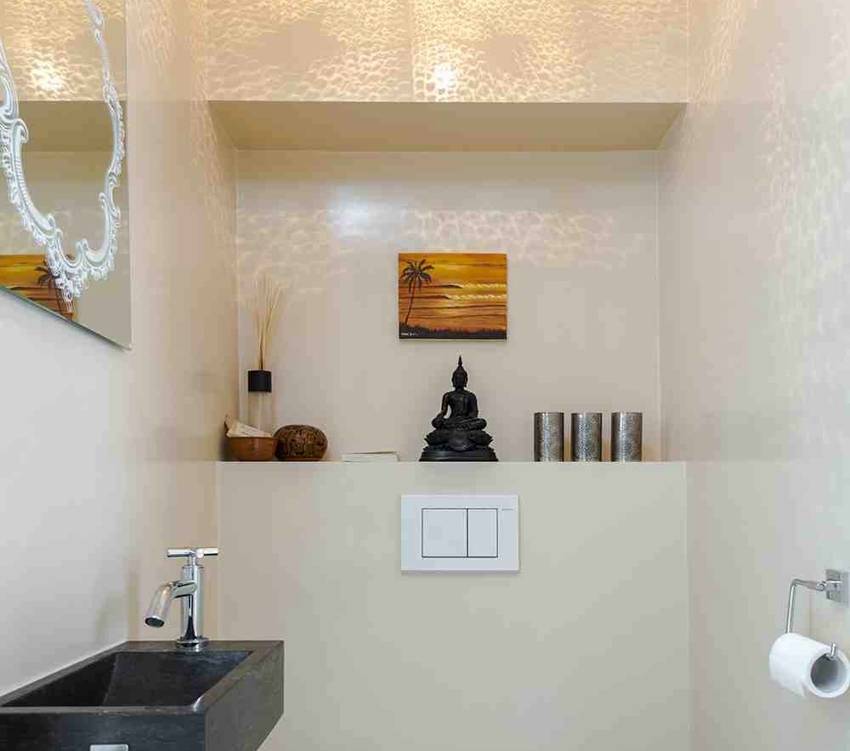 Эффектно и презентабельно будет выглядеть ниша с полками или столешница из гипсокартона в ванной, отделанная венецианской штукатуркой. В составе присутствует мука мрамора, которая на поверхности создает легкий перелив. Материал наносится тонким слоем при помощи шпателя. После полного высыхания излишки и шероховатости удаляются с поверхности. Таким образом поэтапно наносится 10 слоев штукатурки. Завершающим этапом создания мраморной поверхности является нанесение белого воска и его полировка.