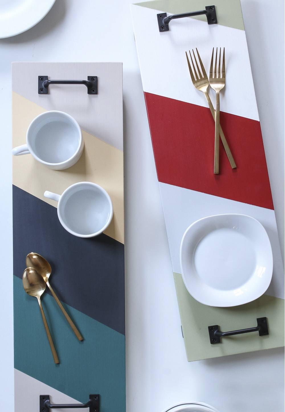А вот идея необычной сервировочной доски-подноса, которая хоть и не является разделочной (предназначена для выкладки продуктов лишь в посуде), тем не менее может быть очень функциональна. Например, ее можно использовать для красивой подачи к столу закусок к напиткам (оливок, фисташек, орешков, чипсов и пр.), соусов, меда, сметаны, варенья. Благодаря грифельной части, пока доска не применяется по назначению, ее можно просто вешать на стену и использовать для записей.