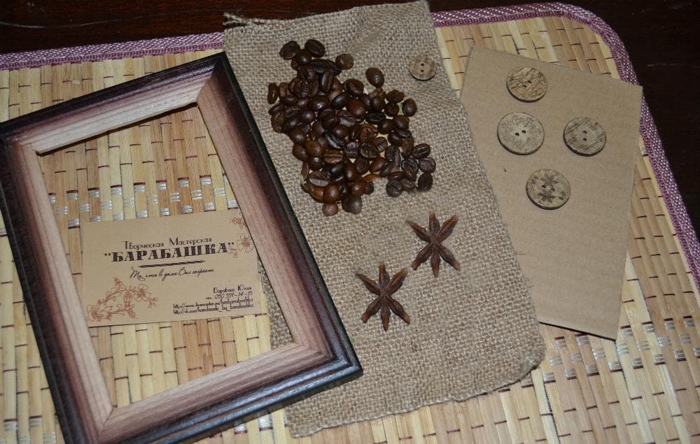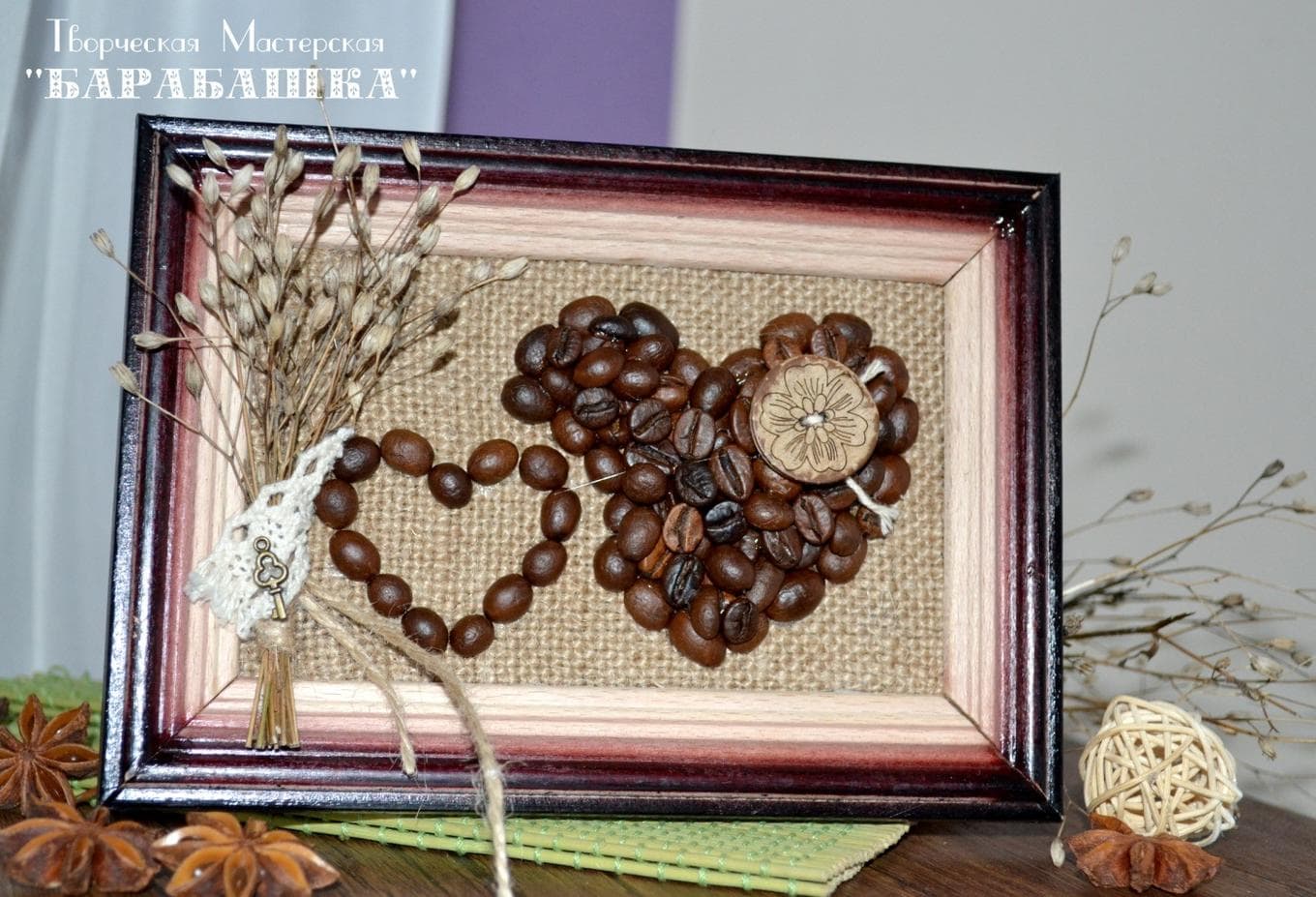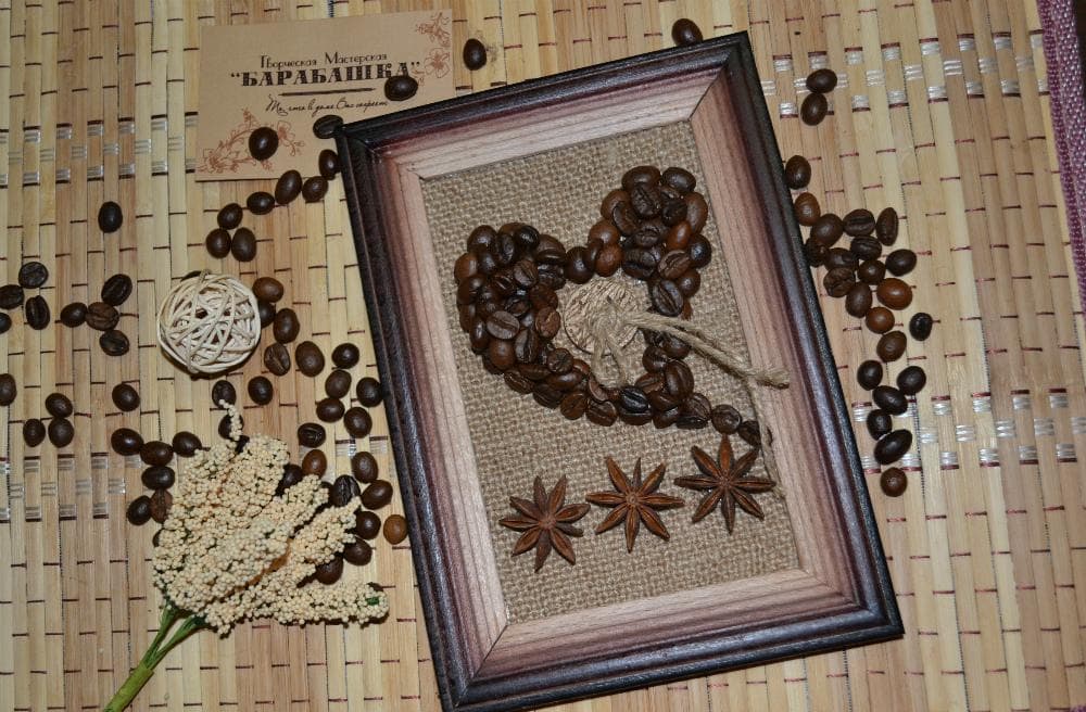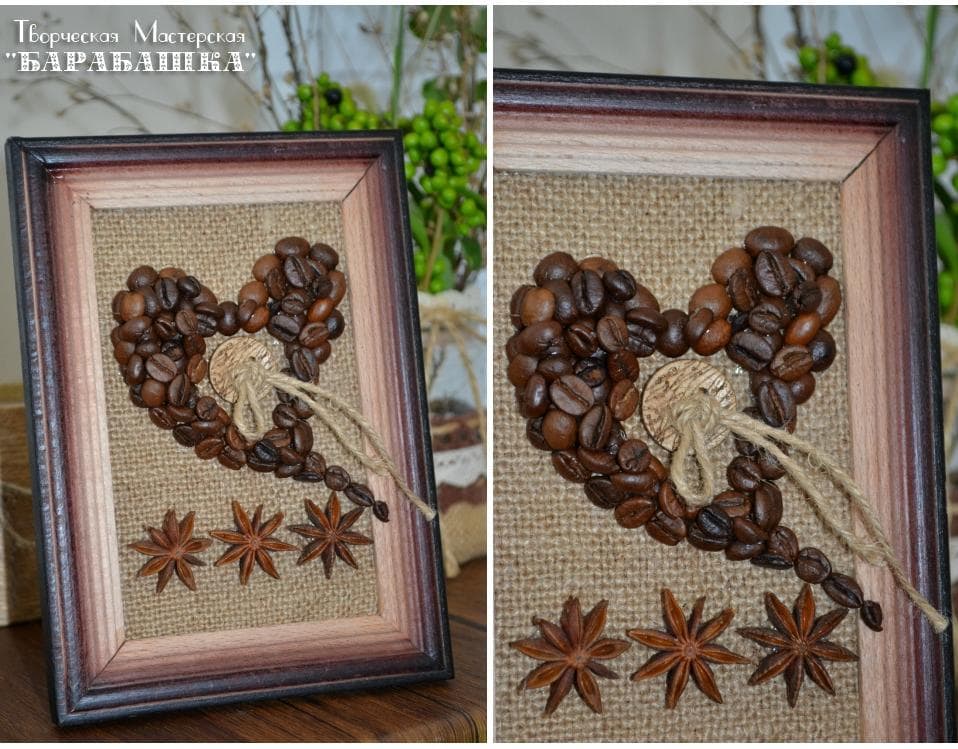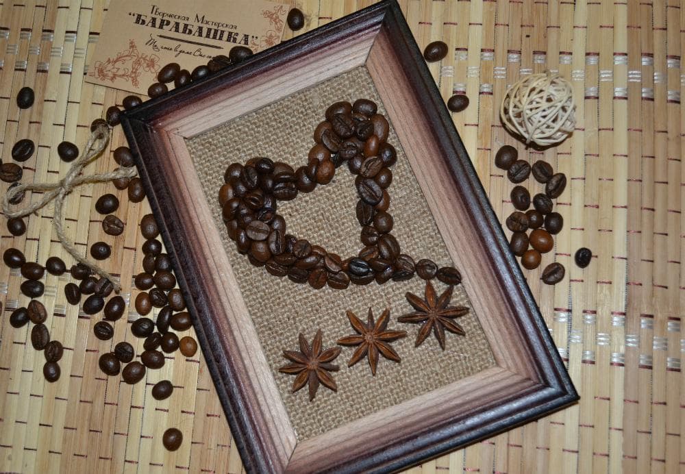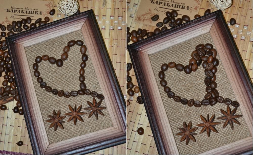 На нижнюю часть приклеиваем три штуки бадьяна. Над ними начинаем выкладывать красивое сердце из кофейных зерен.