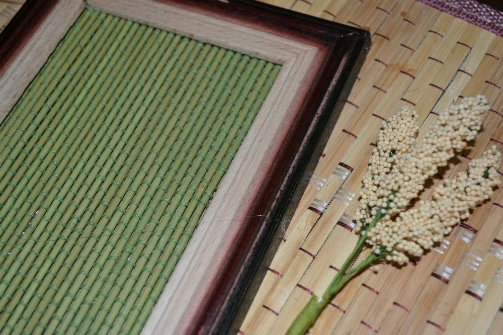 По размерам заготовки из картона вырезаем кусок бамбукового коврика. Склеиваем две детали между собой.