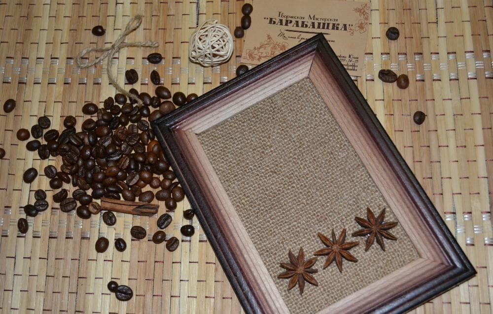Приклеиваем мешковину на картон и вставляем в рамку.