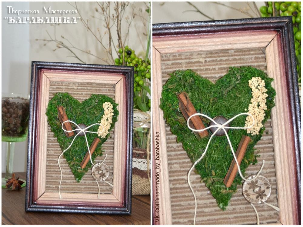 Приклеиваем сердце к картону. Украшаем его палочкой корицы и другим дополнительным декором.