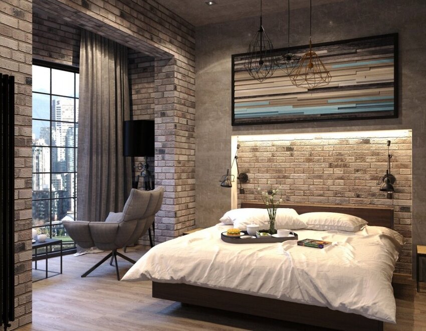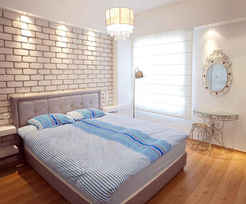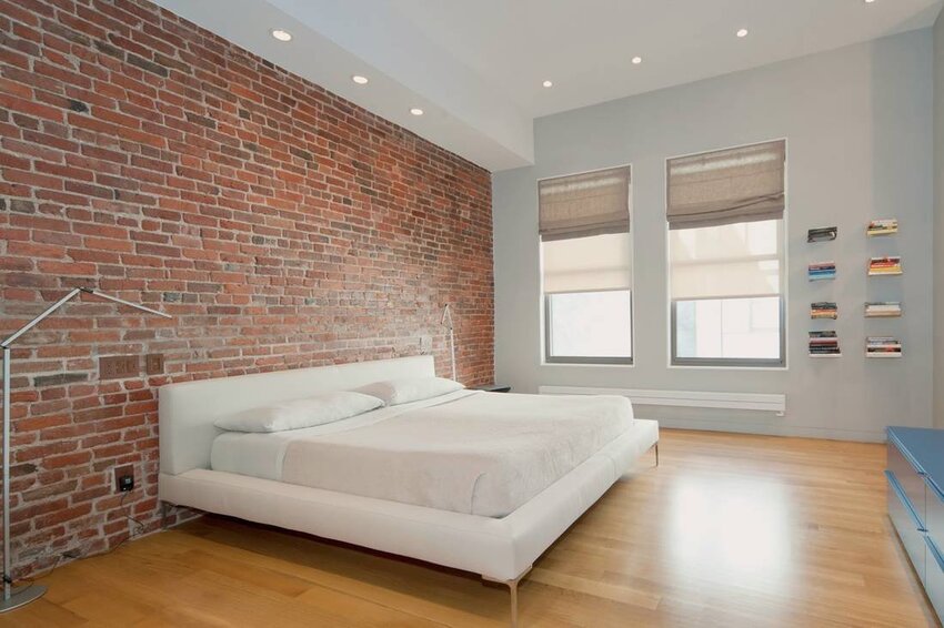 К примеру, кирпичная стена в интерьере спальни подойдет для стиля лофт или прованса. Такая отделка стены над кроватью может выглядеть брутально или романтично, все зависит от выбранной текстуры и цвета кирпича.